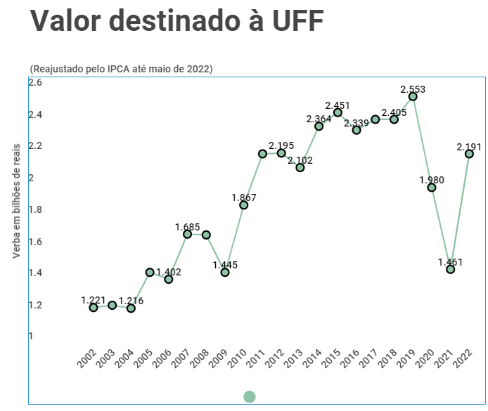- Em 2021, o MEC bloqueou R$ 1,55 bilhão da Educação, dos quais R$ 13,1 milhões pertenciam a UFF. Além disso, o orçamento foi 16,5% menor que o de 2020;